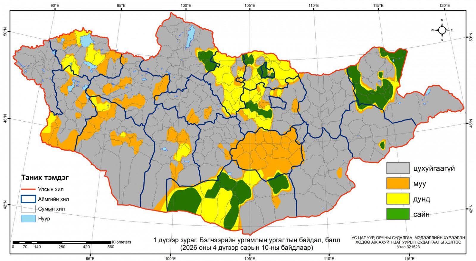 Ус цаг уур, орчны судалгаа, мэдээллийн хүрээлэнгээс гаргасан мэдээгээр дөрөвдүгээр сарын 10-ны байдлаар нийт нутгийн 60 гаруй хувьд бэлчээрийн ургамал цухуйгаагүй буюу өмнө жилийн мөн үетэй харьцуулбал зарим нутгаар цухуйлт оройтож байна.