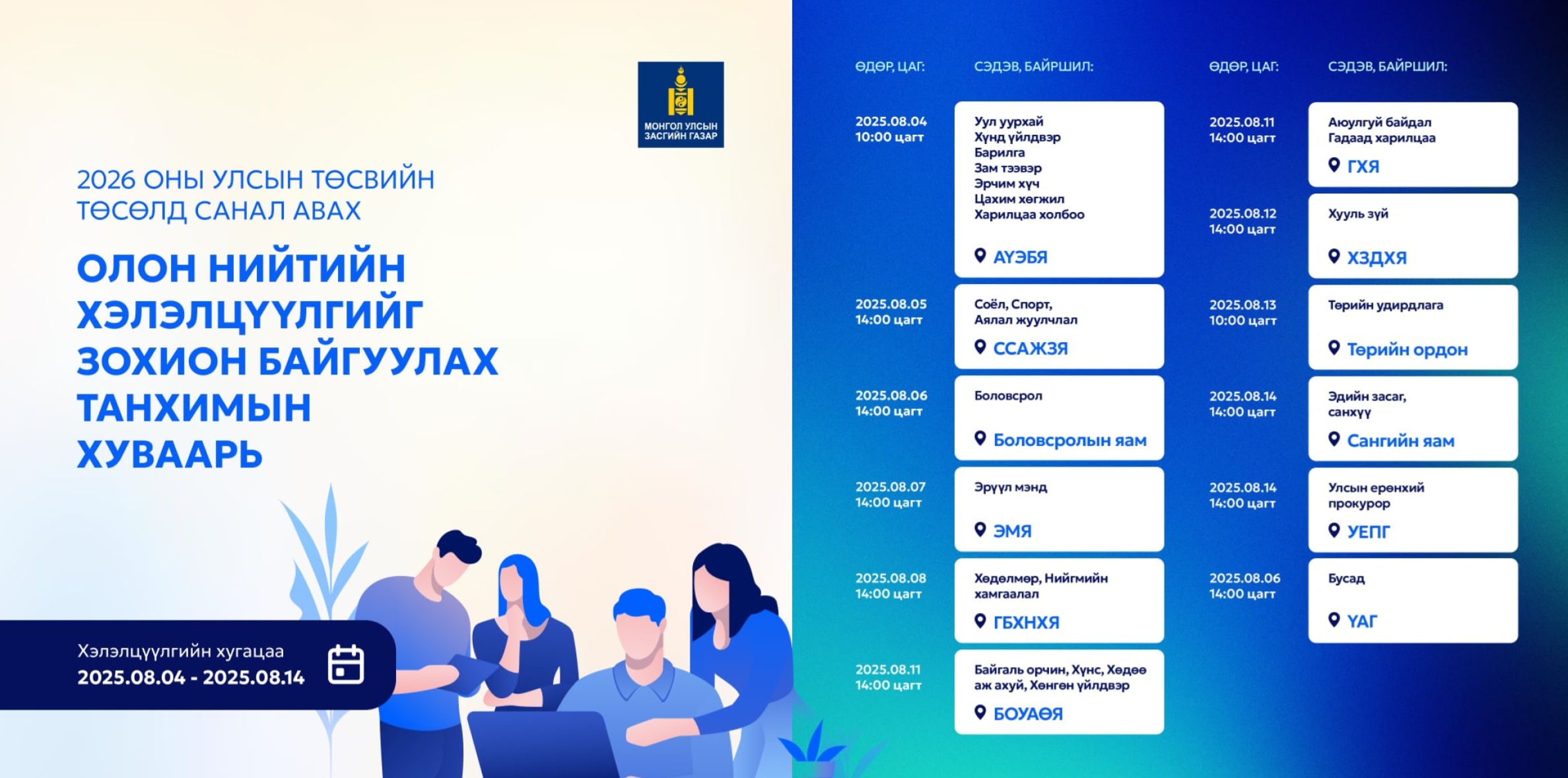 Хэлэлцүүлэгт оролцох бол цахимаар болон биечлэн бүртгүүлнэ. Ирэх оны төсвийн төслийг боловсруулах үйл явцын хоёр дахь үе шат ийнхүү эхэлж байна. Эдийн засгийн үр ашигтай, зардал бууруулах саналыг нэгтгэн эрэмбэлж, 2026 оны төсвийн төсөлд тусгах юм.