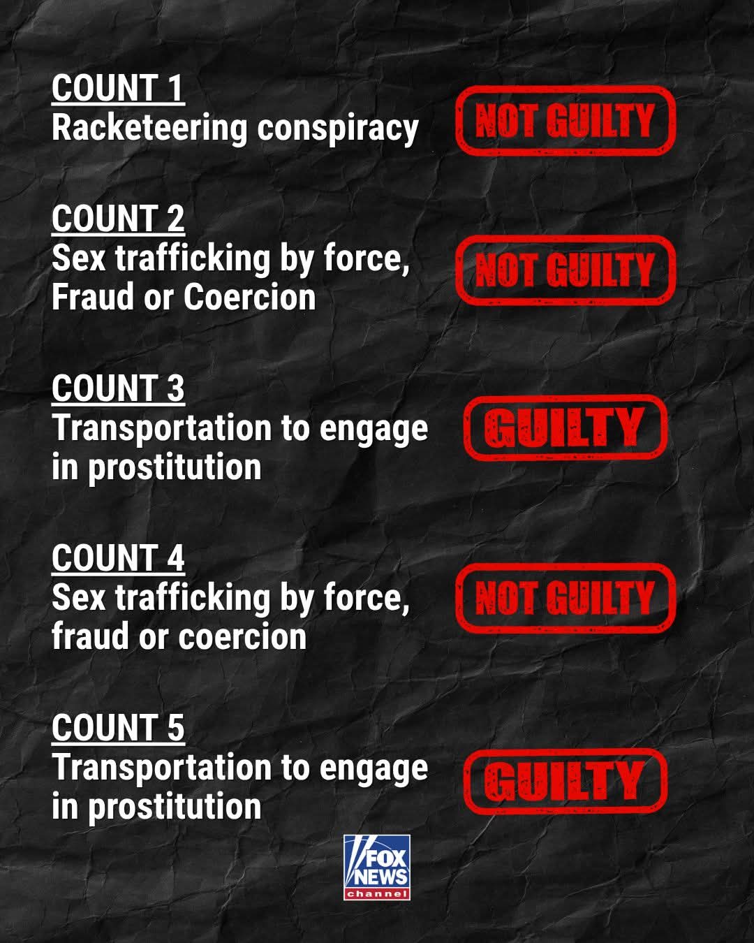 Өдгөө 55 настай, нэр хүнд нь унасан реппер Шон Дидди Комбст бэлгийн мөлжлөг, зохион байгуулалттай гэмт хэргийн хамсаатан болох (racketeering conspiracy), биеэ үнэлэлтийн зорилгоор хүнийг тээвэрлэх гэсэн гурван үндэслэлээр буруутгагджээ. Шүүх түүнийг бэлгийн мөлжлөг болон зохион байгуулалттай гэмт хэргийн хамсаатан гэсэн хоёр зүйл ангиар буруугүй, харин биеэ үнэлэлтийн зорилгоор хүнийг тээвэрлэсэн гэх нэг зүйл ангиар буруутай гэж үзсэн.