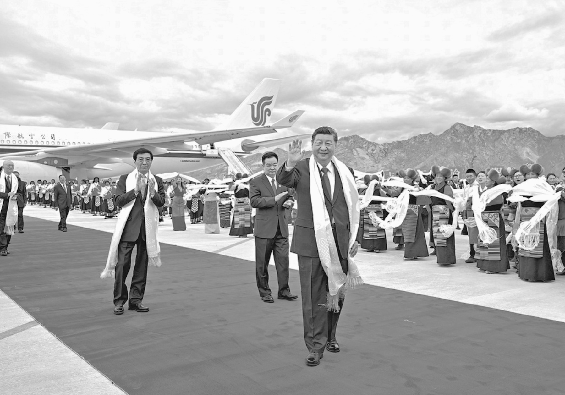 БНХАУ-ын Коммунист Намын (ХКН) Төв Хорооны Ерөнхий нарийн бичгийн дарга, БНХАУ-ын дарга, Төв Цэргийн комиссын дарга Ши Жиньпин лхагва гарагт Шизангийн өөртөө засах орны нийслэл Лхаст хүрэлцэн ирж, пүрэв гарагт болох бүс нутгийн 60 жилийн ойг тэмдэглэх их наадамд оролцохоор ирэхдээ ард олон руу даллан мэндчилж буй нь.