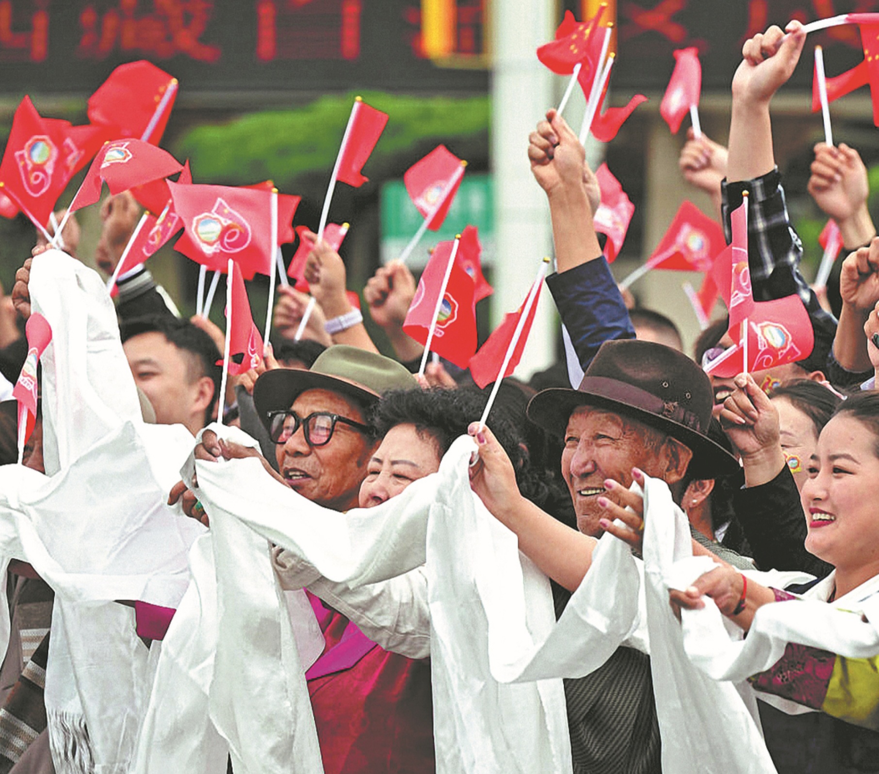 Ши дарга болон төв төлөөлөгчдийг Лхаст олон түмэн гудамжинд жагсан, баярлан цэнгэж, дуу хууртай угтав. Зургийг Синьхуа агентлаг.