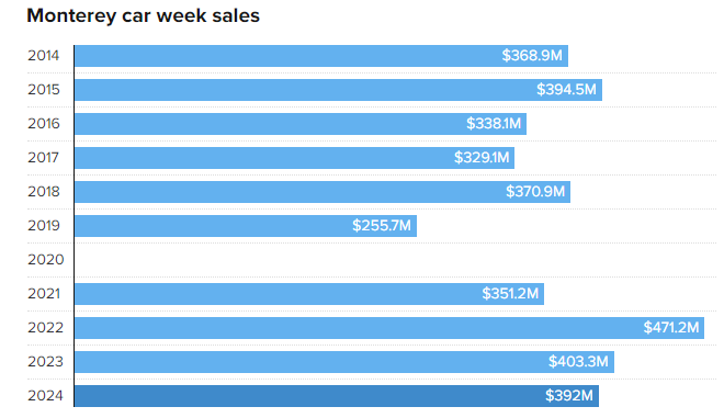 Өнгөрсөн долоо хоногт "Монтерей"-ийн автомашины дуудлага худалдааны борлуулалт өнгөрсөн жилийнхээс 3%-иар буурч, хуучин машинаас шинэ машин руу шилжсэнээр 1950, 1960-аад оны үеийн борлогдоогүй сонгодог бүтээлүүдийн бөөгнөрөл бий болжээ.