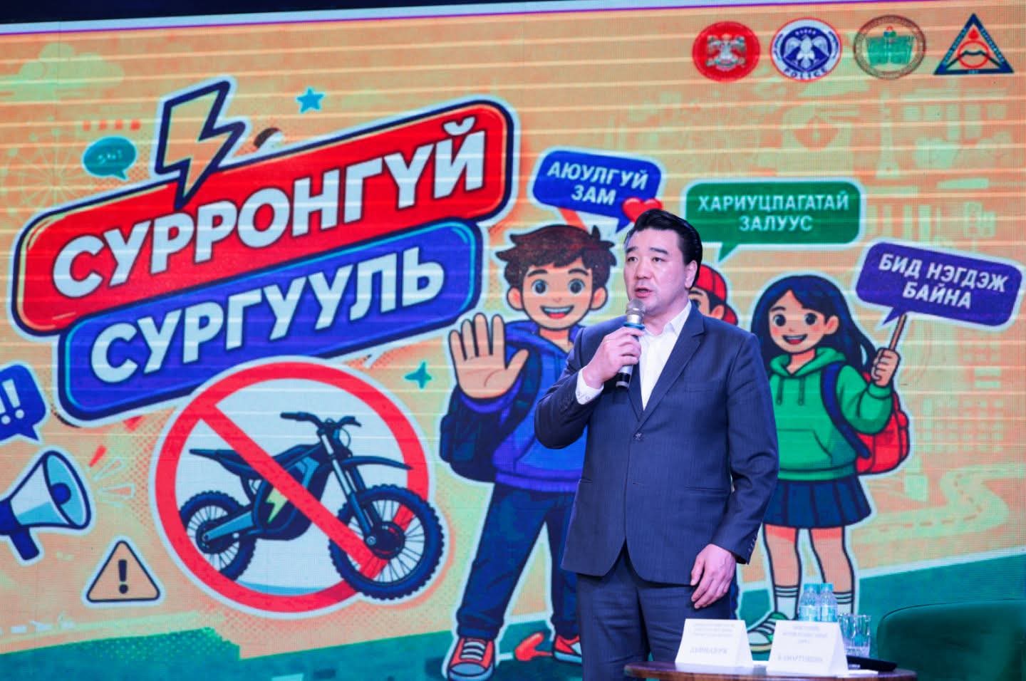 ...Өдөрлөгийг нээж НИТХ-ын дарга бөгөөд Нийслэлийн гэмт хэргээс урьдчилан сэргийлэх ажлыг зохицуулах салбар зөвлөлийн дарга А.Баяр “Өнөөдөр бид хүүхэд, багачуудынхаа аюулгүй орчинд сурч боловсрох эрхийг хамгаалах, замын хөдөлгөөний соёлыг төлөвшүүлэхийн төлөө “Сурронгүй сургууль” өдөрлөгийг Шинэ Монгол Харүмафүжи сургууль дээр эхлүүлж байна. Нийгэмд зөв үлгэр дуурайл, манлайллыг өөрсдөөсөө эхлүүлж буй Шинэ Монгол Харүмафүжи сургуулийнхандаа, Монголчууд бидний бахархал болсон Их аварга Харүмафүжи Д.Бямбадорж танд чин сэтгэлийн талархал дэвшүүлье. Сурагчдын аюулгүй байдал бол сургалтын чанараас дутахгүй чухал үнэт зүйл юм. Иймд сургуулийн орчинд эдгээр тээврийн хэрэгслийн хэрэглээг зохицуулах, хориглох бодлого хэрэгжүүлэх, урьдчилан сэргийлэх ажлыг идэвхжүүлэхийг бүх сургуулиудын удирдлагуудад уриалж байна. Мөн амин хайртай хүүхдэдээ амь эрсдэх зэвсэг бүү авч өгөөрэй гэж эцэг эхчүүдээ уриалмаар байна” гэв.