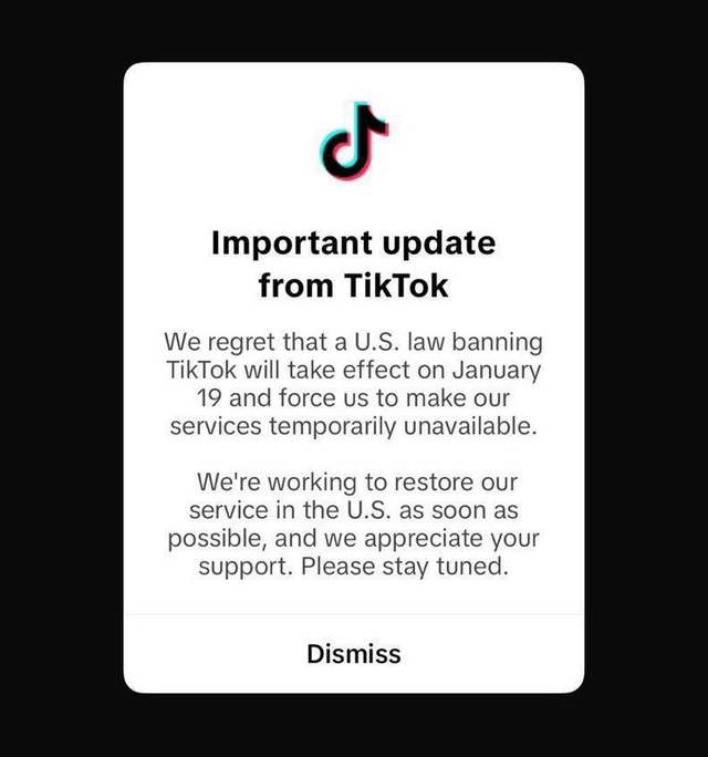 АНУ-ын хэрэглэгчид апплекейшнд нэвтрэх оролдлого хийх үед, "TikTok"-ийг хориглосон хууль хэрэгжиж эхэлсэн тул ашиглах боломжгүй гэсэн зурвас гарч ирж байна.