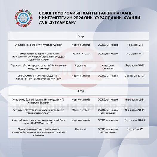 Олон улсын ачаа, зорчигч тээврийг хөгжүүлэх, Евразид төмөр замын тээврийн нэгдсэн орон зайг бий болгох, тив хоорондын төмөр замын тээврийн сувгийн өрсөлдөх чадварыг сайжруулах, төмөр замын тээврийн салбарт технологийн дэвшил, шинжлэх ухаан, технологийн хамтын ажиллагааг дэмжих зорилготой Төмөр замуудын хамтын ажиллагааны байгууллага болох "ОСЖД"-ийн 2024 оны 07, 08 дугаар сард зохион байгуулагдах хуралдааны хуваарийг танилцуулж байна.