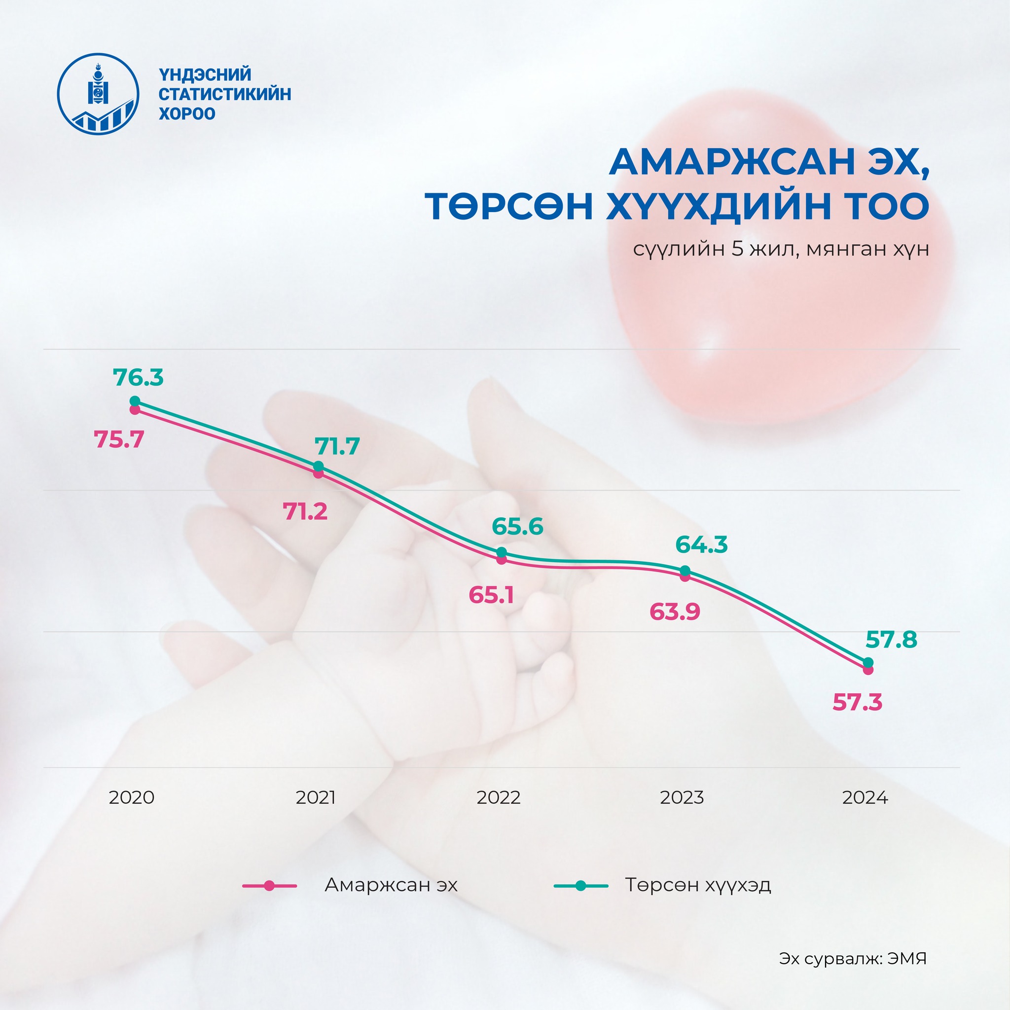 2020 онд 76.3 мянган хүүхэд төрсөн бол 2024 оны байдлаар 32 хувиар буурч 57.8 мянган хүүхэд төржээ.