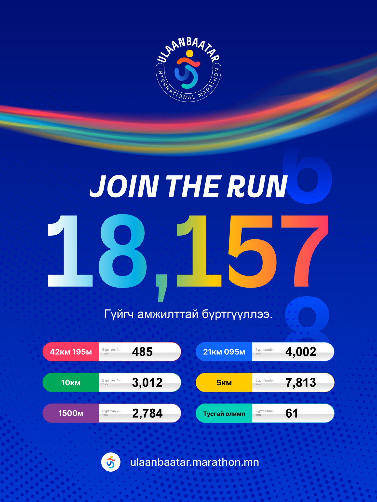 “Улаанбаатар марафон-2026” олон улсын гүйлтийн бүртгэл хаахад гурав хоног үлдлээ. Марафонд гүйх оролцогчдыг тавдугаар сарын 1-ний 17:00 цаг хүртэл бүртгэнэ. Оролцогчид Hipay аппликейшн болон ulaanbaatar.marathon.mn цахим хуудсаар дамжуулан бүртгүүлэх боломжтой. Өдгөө 11 дэх удаа зохион байгуулах гэж буй “Улаанбаатар марафон-2026” олон улсын гүйлтэд оролцохоор өнөөдрийн байдлаар 18 мянга гаруй хүн бүртгүүлээд байна.