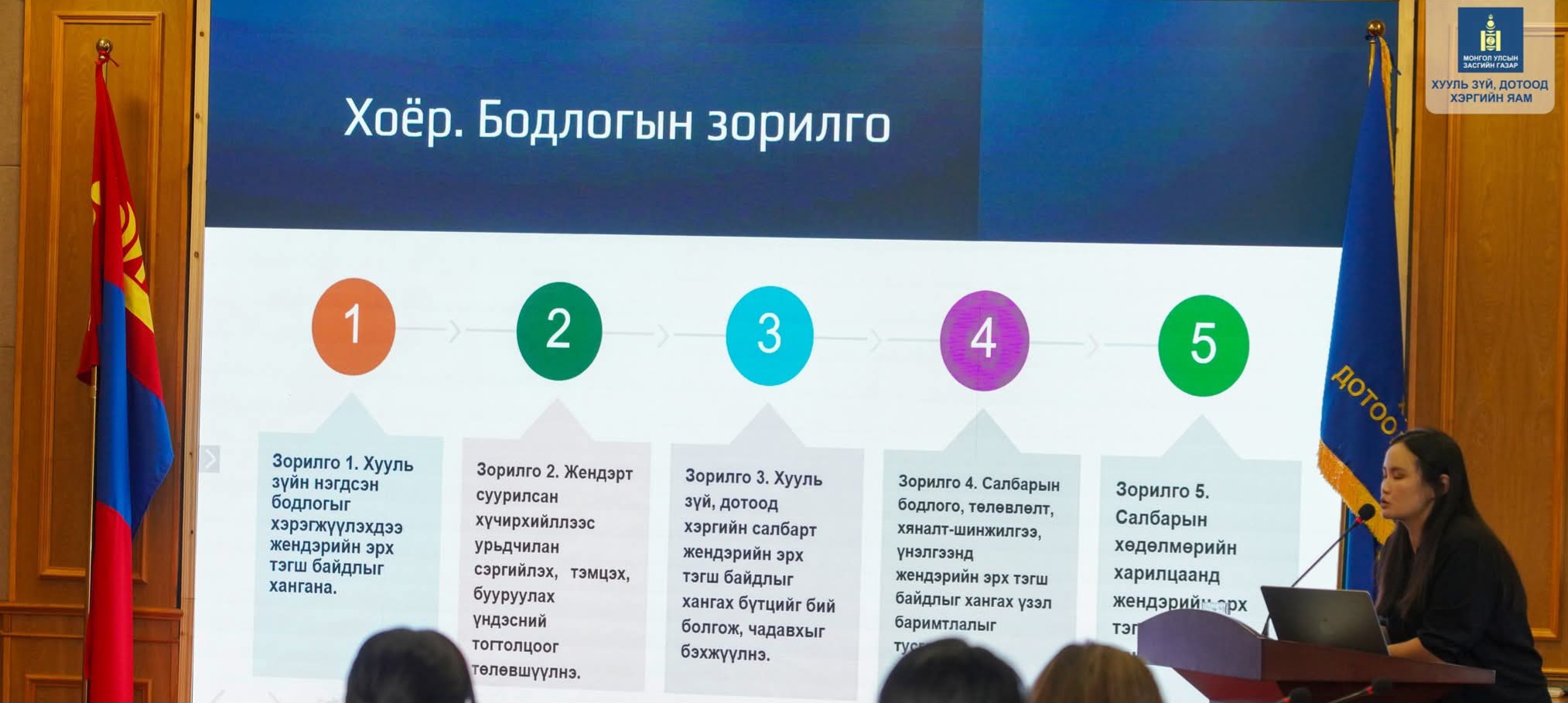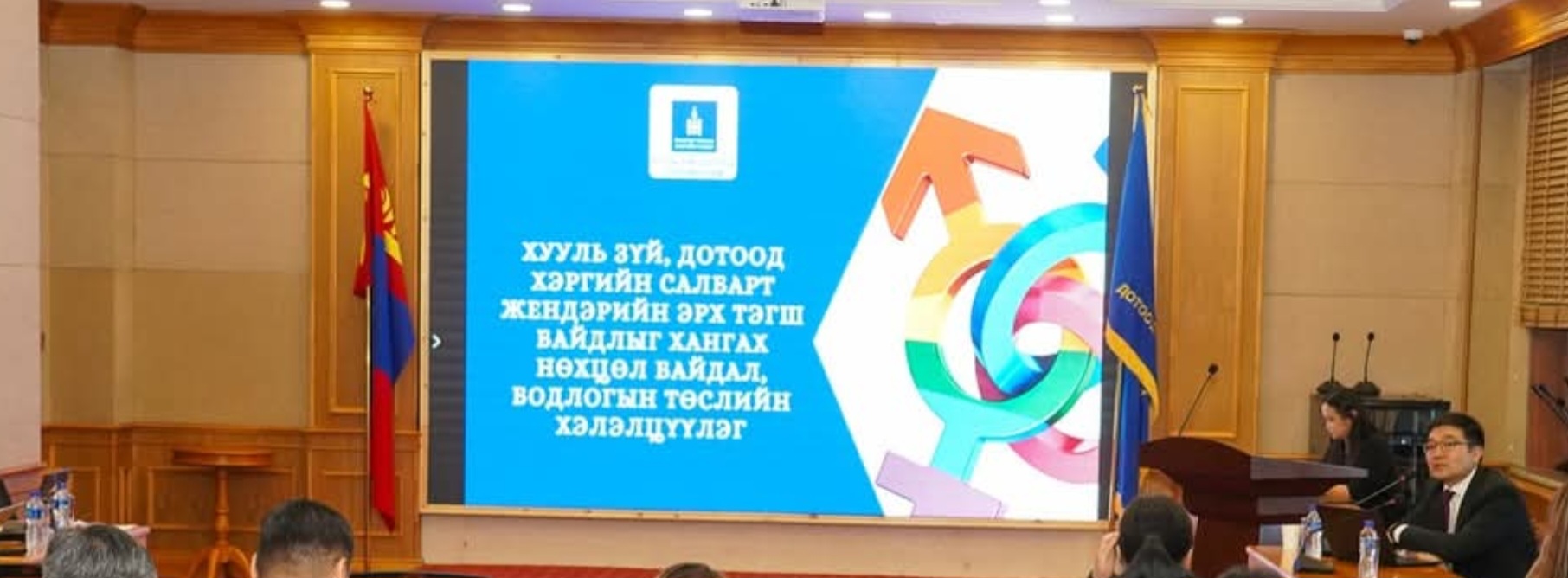 Уг зорилтын хүрээнд Сургалт, сурталчилгаа, хөтөлбөрийн хэрэгжилтийн газраас өнөөдөр “Хууль зүй, дотоод хэргийн салбарт жендэрийн эрх тэгш байдлыг хангах нөхцөл байдал, бодлогын төслийн хэлэлцүүлэг”-ийг зохион байгуулж, салбарын хэмжээнд жендэрийн эрх тэгш байдлыг хангах нөхцөл байдлын судалгааны дүнг танилцуулан, шинэ бодлогын төслийг хэлэлцлээ.